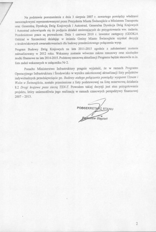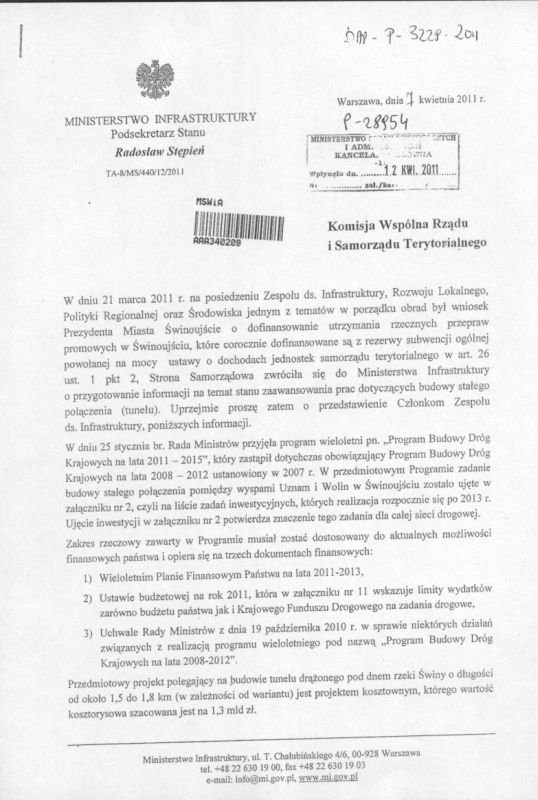Pismo Podsekretarza Stanu w Ministerstwie Infrastruktury Radosława Stępnia do Komisji Wspólnej Rządu i Samorządu Terytorialnego dotyczące stanu zaawansowania prac dotyczących budowy stałego połączenia.