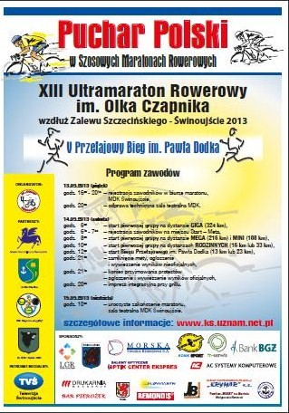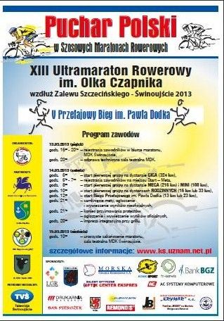 Już po raz ze Świnoujścia trzynasty wystartuje Ultramaraton Rowerowy im. Olka Czapnika wzdłuż Zalewu Szczecińskiego. 14 września na trasę ze Świnoujścia do Stepnicy wyruszą zawodnicy amatorzy i sympatycy kolarstwa z całego kraju. Celem każdego z nich będzie, jak co roku, pokonywanie własnych ograniczeń i walka o każdą sekundę na jednym z trzech dystansów (108, 216 lub 324km). Informacje i zgłoszenia na www.ks.uznam.net.pl