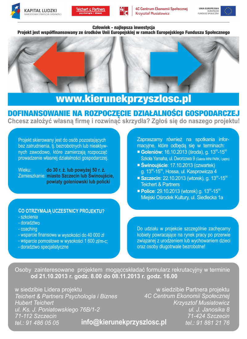 Liderem projektu jest Teichert & Partners Psychologia i Biznes Hubert Teichert ulica Ks. J. Poniatowskiego 76B/1-2 Szczecin, telefon 91 486 05 05, www.terechert.pl . Osoby zainteresowane projektem mogą składać u lidera formularze rekrutacyjne w terminie od 21. października do 8. listopada 2013. Natomiast sam formularz, pełen regulamin rekrutacji oraz więcej informacji o projekcie dostępne są w biurach projektu lub na stronie: www.kierunekprzyszlosc.pl.