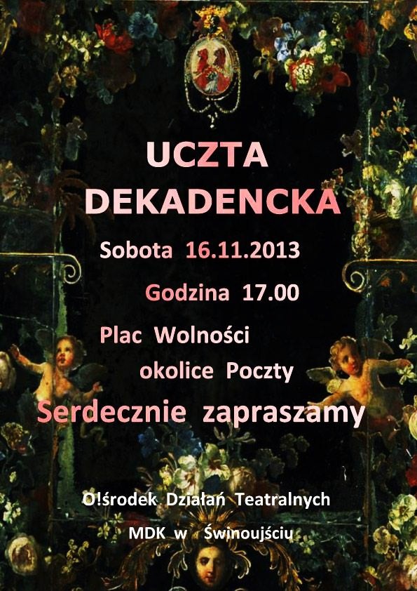 UCZTA DEKADENCKA O!środka Działań Teatralnych Miejskiego Domu Kultury w Świnoujściu odbędzie się 16 listopada 2013 r. o godz.17.00 na placu Wolności (pomiędzy restauracją "Neptun" a budynkiem Poczty Polskiej). Organizatorzy zapraszają wszystkich nie tylko jako widzów, ale również do czynnego uczestnictwa w tym niecodziennym wydarzeniu.