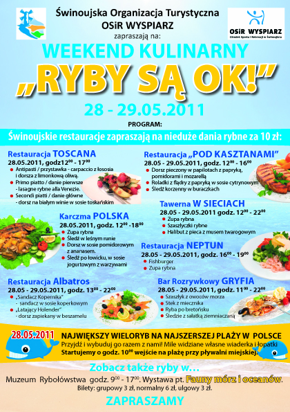Zapraszamy wszystkich gości, sąsiadów, mieszkańców. W programie oprócz swoistego szlaku po restauracjach zapraszamy do obejrzenia ryb…. w Muzeum Rybołówstwa. Aktualna wystawa to ryby bałtyckie, Zalewu Szczecińskiego, zatoki Pomorskiej. Zobaczyć także można znakomicie spreparowanych przedstawicieli fauny na Antarktyce oraz mórz tropikalnych.