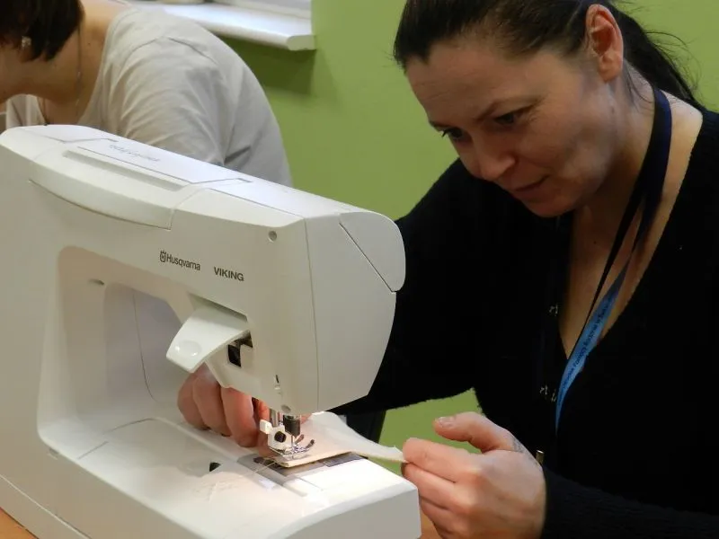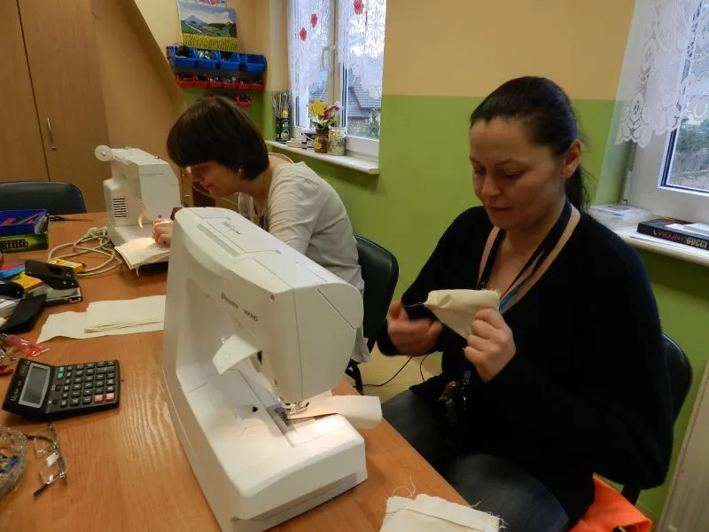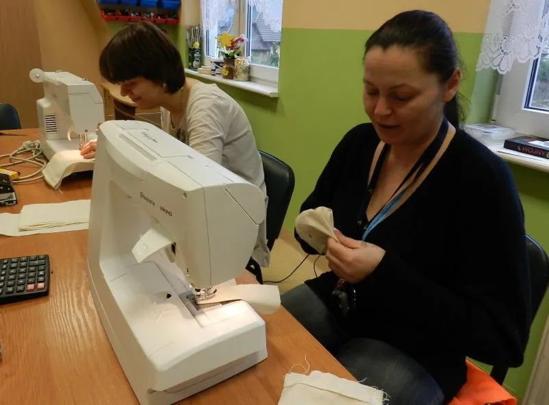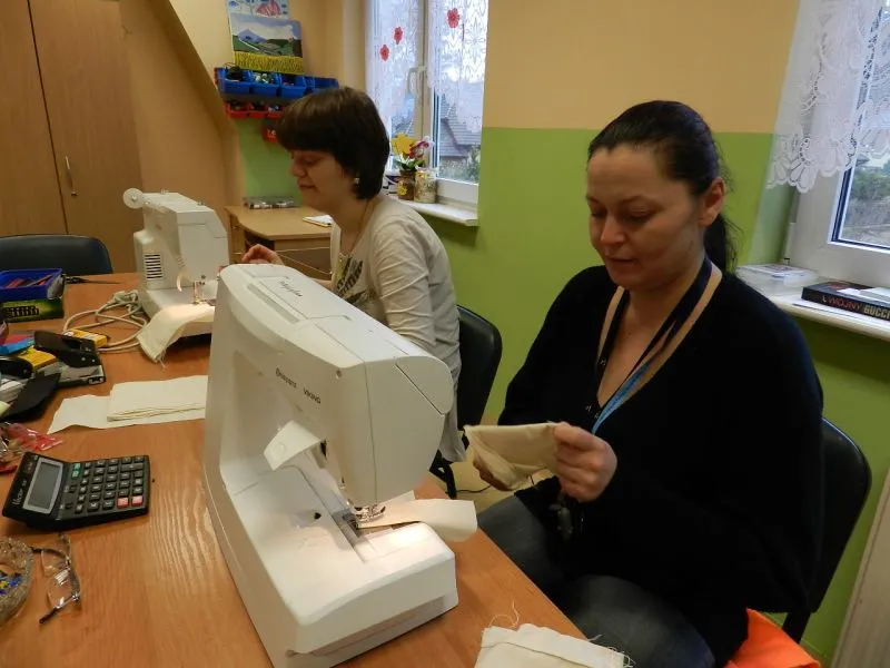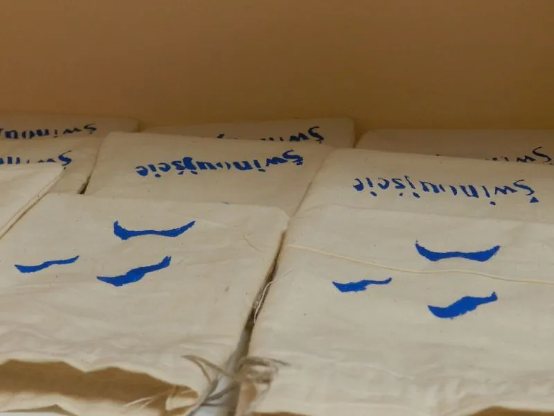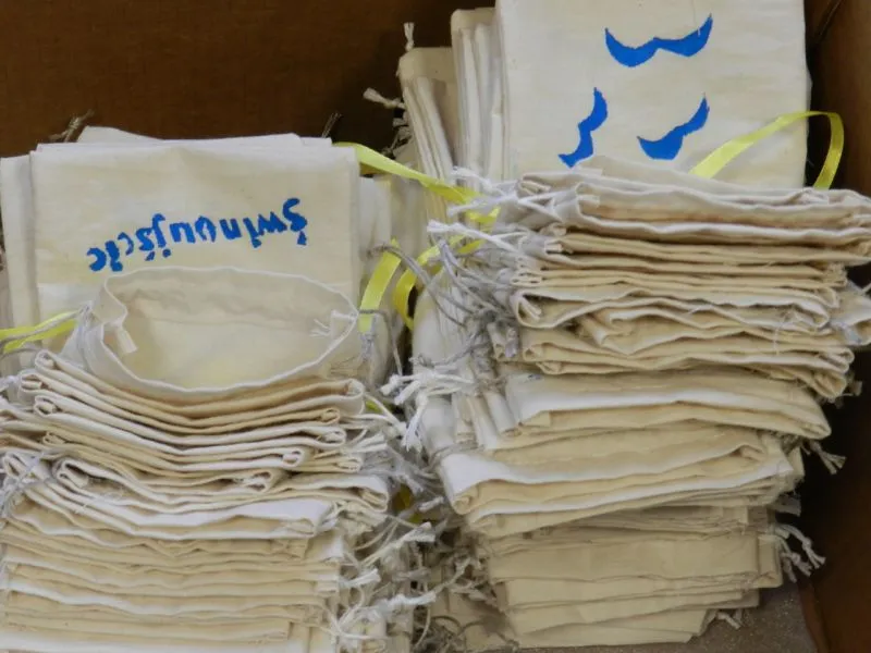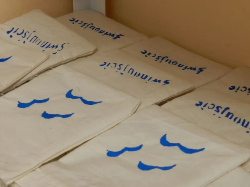 Jedni kroją materiał i szyją z niego woreczki, inni wciągają sznureczki do ściągania tych woreczków, a jeszcze inni przygotowują szablony z napisem „Świnoujście” i przypominające mewy.