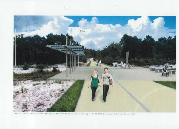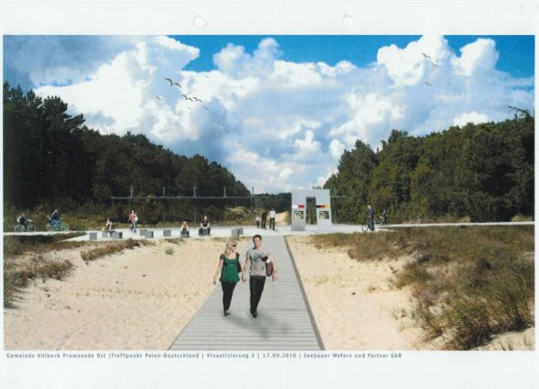 Na granicy państw, w miejscu połączenia się ścieżek rowerowych (polskiej i niemieckiej) powstaje platforma o powierzchni ok. 425 m2. Od niej, w kierunku plaży, odchodzić będzie kładka zakończona  punktem widokowym na morze. Na platformie zaplanowano  niewielkie stanowisko w postaci bramy wykonanej ze stali szlachetnej, symbolizujące integrację regionu przygranicznego.