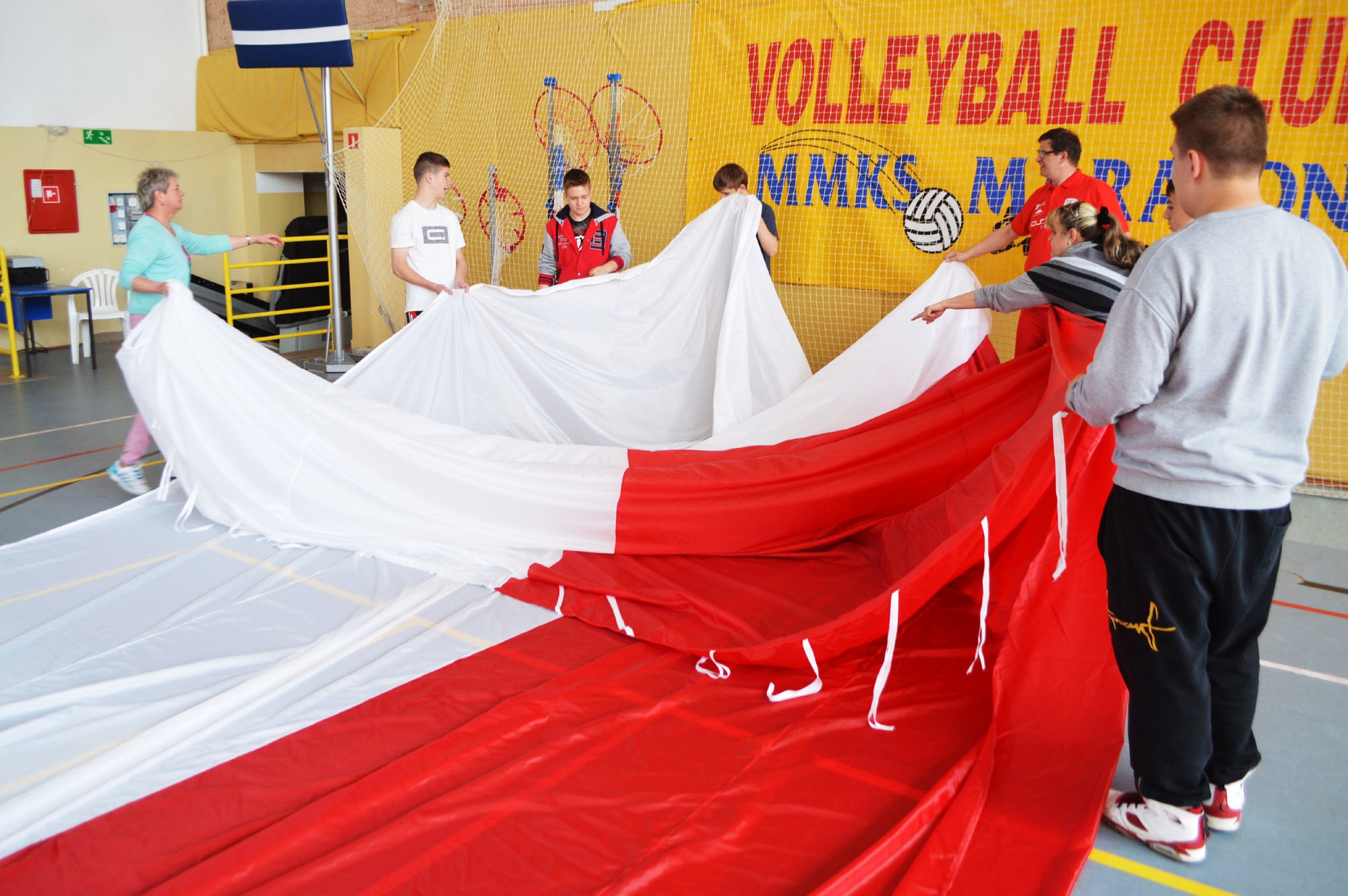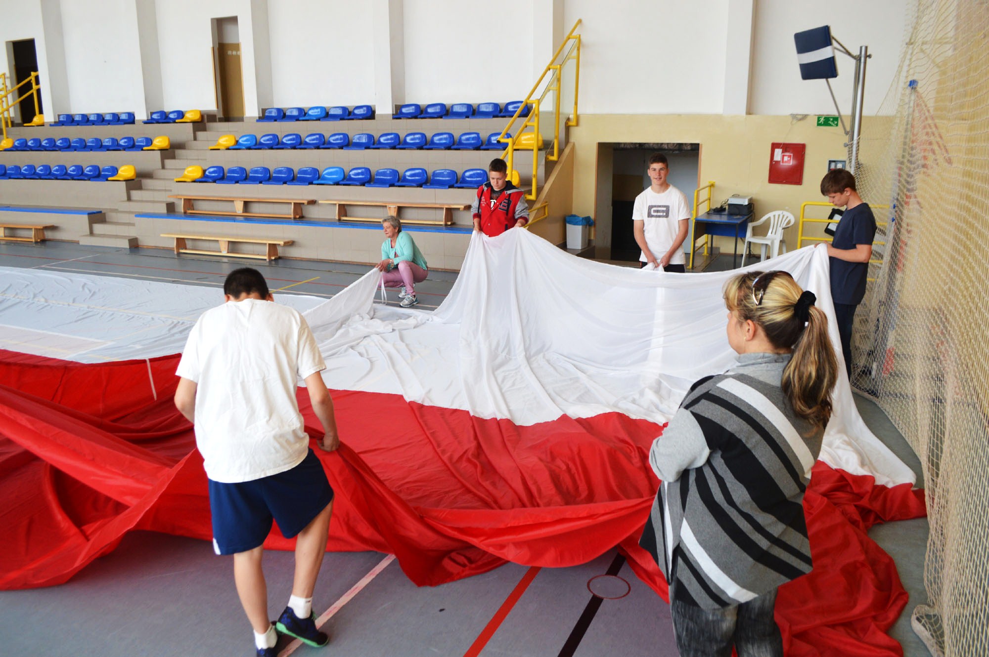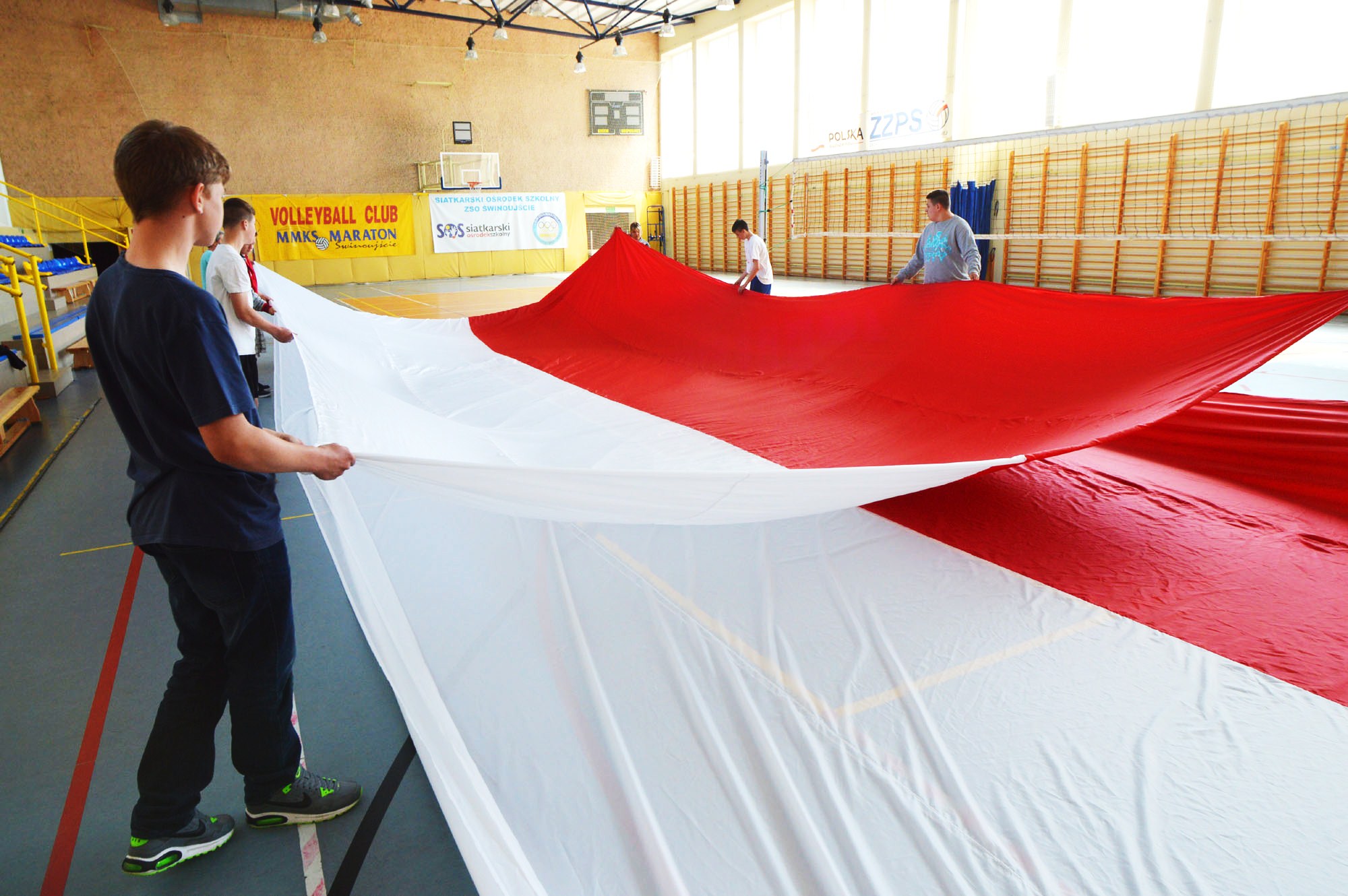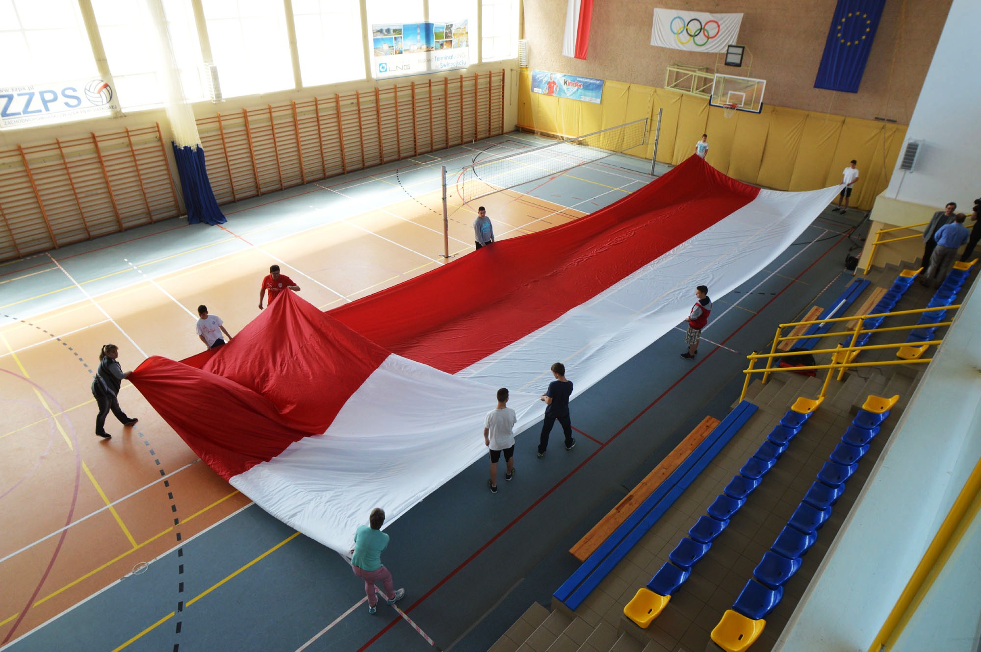 - Musieliśmy znaleźć miejsce do złożenia flagi. W pracowni krawieckiej było zbyt ciasno. Pomysł padł na halę sportową. Pan dyrektor gimnazjum zgodził się bez wahania. Pomogli uczniowie. Operacja przebiegła całkiem sprawnie. Flaga jest tak ogromna, że musiało ją składać aż 10 osób – tłumaczy Martyna Napart ze Świnoujskiej Organizacji Turystycznej.