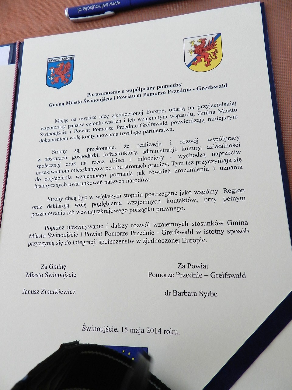 Dziś w Świnoujściu, w Galerii Art Miejskiego Domu Kultury, Prezydent Świnoujścia Janusz Żmurkiewicz oraz dr Barbara Syrbe, w obecności przedstawicieli władz samorządowych, radnych i osób odpowiedzialnych za współpracę przygraniczną podpisali porozumienie o współpracy pomiędzy Miastem na Prawach Powiatu Świnoujście i powstałym, w wyniku reformy administracyjnej w Niemczech , Powiatem Pomorze Przednie - Greifswald, obecnie trzecim co do wielkości powiatem Republiki Federalnej Niemiec.