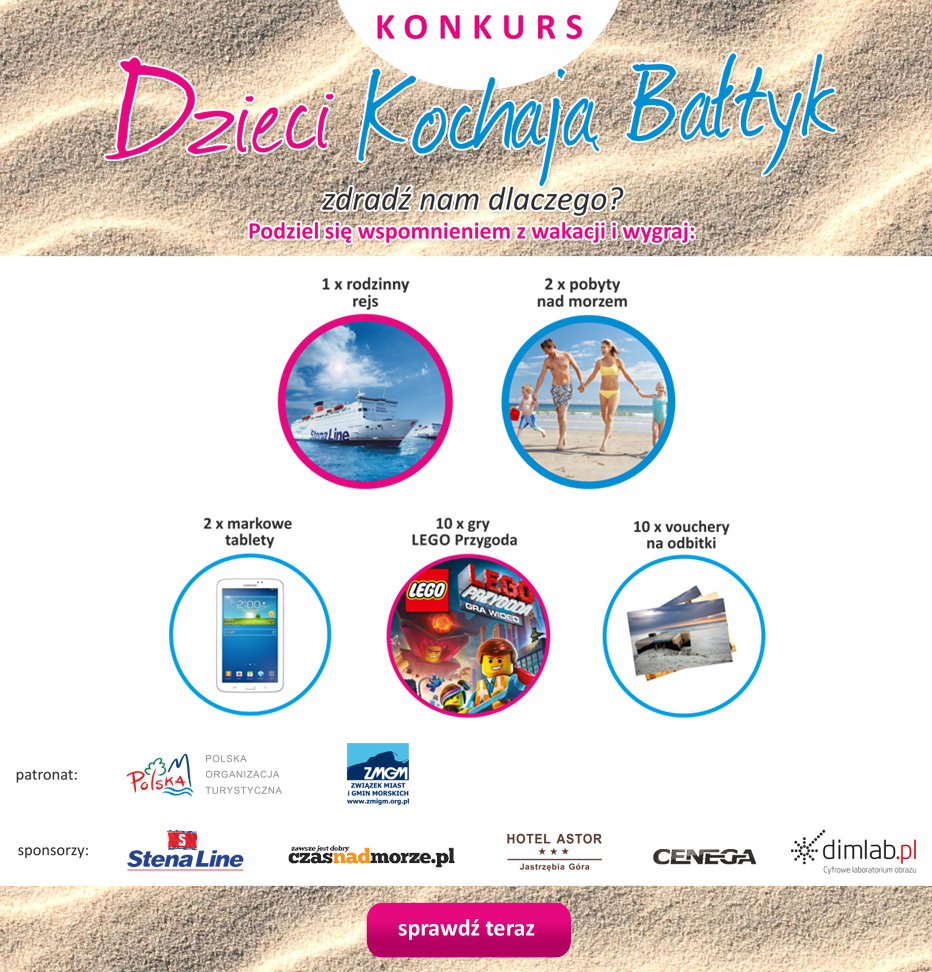 Dzięki Waszym relacjom stworzymy największą mapę pomysłów i rekomendacji na rodzinny wypoczynek nad Bałtykiem…a przy okazji możesz wygrać atrakcyjne nagrody dla Twojej rodziny: weekend na morzu, rodzinne pobyty nad morzem, vouchery na zdjęcia i foto-pamiątki z wakacji oraz gry Lego Przygoda. Nagrodą specjalną oraz nagrodą publiczności są markowe tablety.