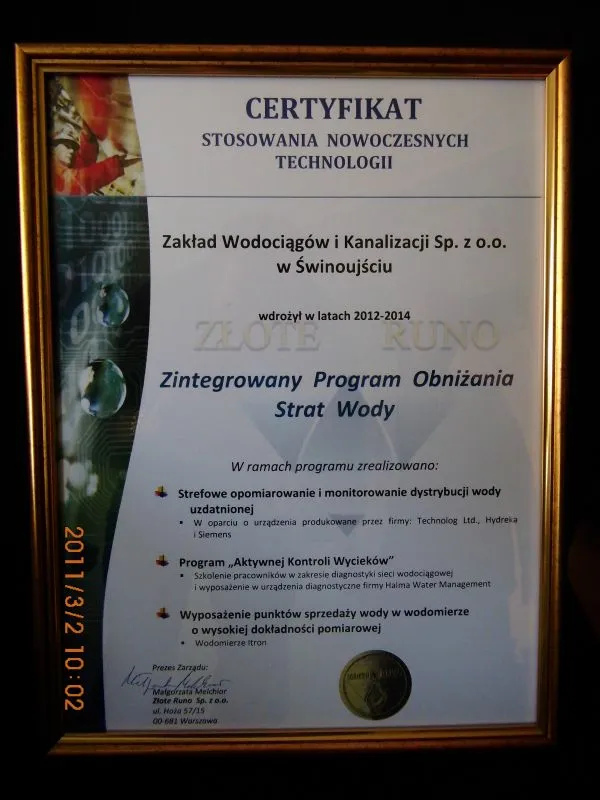 Miłym akcentem były wystąpienia Pani Prezydent Michalskiej, przedstawiciela Izby Gospodarczej Wodociągi Polskie – Z-cy Przewodniczącego Rady Izby Pana Ryszarda Sobieralskiego oraz  przedstawiciela Zachodniopomorskiego Forum Wodociągowego Pana Ryszarda Wójcika. Okoliczność była również okazją do wręczenia naszym wodociągom certyfikatu stosowania nowoczesnych technologii w zakresie wdrażania zintegrowanego programu obniżania strat wody.
