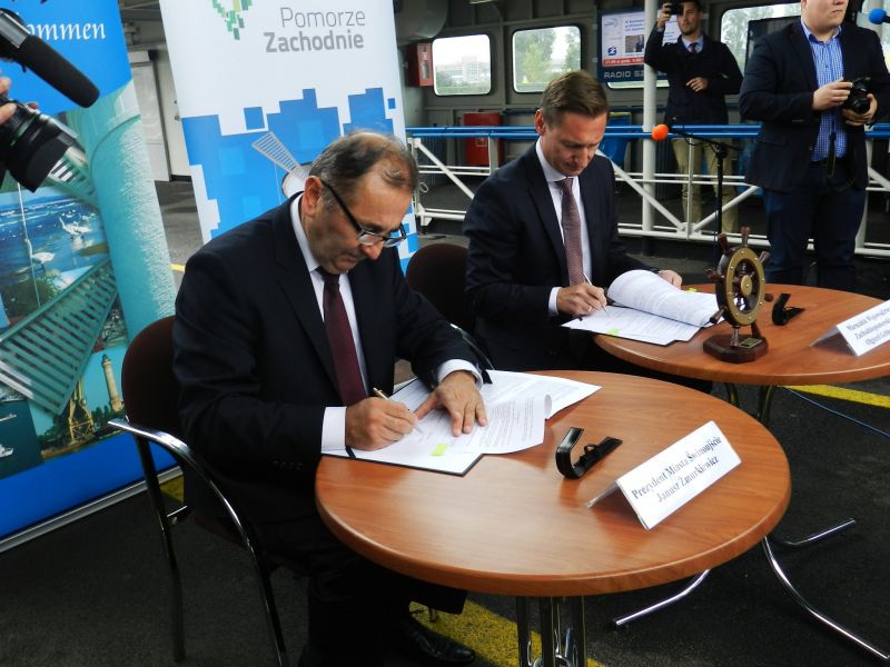 Dziś na pokładzie promu „Bielik” Marszałek Województwa Zachodniopomorskiego Olgierd Geblewicz oraz Prezydent Miasta Świnoujście Janusz Żmurkiewicz podpisali umowę na dofinansowanie opracowania programu funkcjonalno-użytkowego. Dokument pozwoli na rozpoczęcie budowy stałego połączenia pomiędzy wyspami Uznam i Wolin.