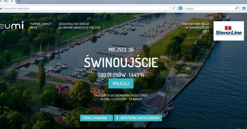 Trzy miasta, które zdobędą najwięcej głosów w nagrodę otrzymają kampanię reklamową w serwisach zumi.pl, Onet.pl oraz Poznaj Polskę. Wystarczy wpisać adres http://turniejmiast.zumi.pl, dalej hasło „Świnoujście” i kliknąć. Serwis organizuje ranking już po raz drugi. Udział bierze w nim 335 miast powiatowych z całego kraju