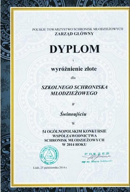 Złote wyróżnienie otrzymało świnoujskie Szkolne Schronisko Młodzieżowe przy ulicy Gdyńskiej w 54. Ogólnopolskim Konkursie Współzawodnictwa Schronisk Młodzieżowych za 2014 rok. - To już kolejne wyróżnienie dla naszej placówki w tym konkursie, w tym po raz drugi z rzędu złote. Placówka działa przy świnoujskim Centrum Edukacji Zawodowej i Turystyki. - Uroczystość otrzymania Złotego Wyróżnienia oraz listu gratulacyjnego od Pani Joanny Kluzik-Rostkowskiej Ministra Edukacji Narodowej odbyła się 25 października 2014 roku w Łodzi – informuje dyrektor CEZiT Pani Gabriela Kopacka.