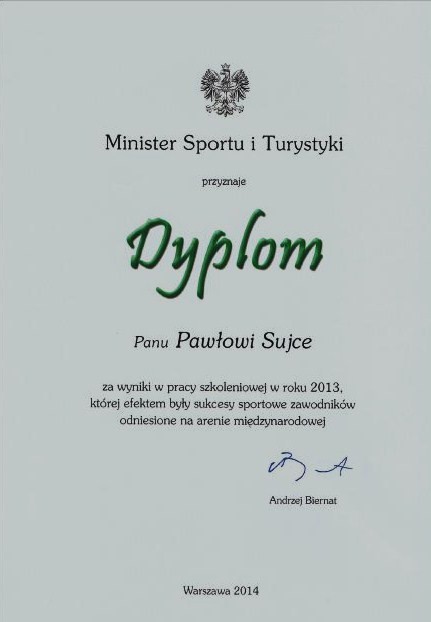Podczas Mistrzostw Polski Seniorów w Karate Kyokushin, sensei Paweł Sujka otrzymał wyróżnienie od Ministra Sportu i Turystyki Andrzeja Biernata za wyniki w pracy szkoleniowej w 2013 roku. Nagrodę wręczył mu Prezes Polskiego Związku Karate Kyokushin Maciej Sokołowski. Paweł Sujka od wielu lat jest trenerem w Świnoujskiej Akademii Karate Kyokushin. W ubiegłym roku podczas Mistrzostw Europy zawodnicy akademii zdobyli aż 7 medali.