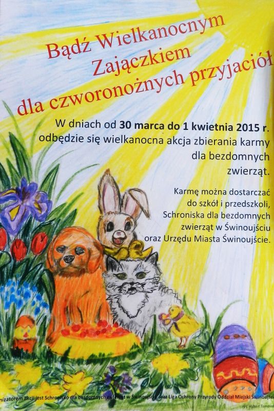 Schronisko dla bezdomnych zwierząt oraz Liga Ochrony Przyrody Oddział Miejski Świnoujście zapraszają wszystkich mieszkańców miasta do włączenia się w wielkanocna akcję zbierania karmy dla bezdomnych zwierząt. Akcja odbędzie się w dniach 30 marca - 1 kwietnia 2015 r. Karmę można przynosić do szkół, przedszkoli, schroniska dla bezdomnych zwierząt oraz urzędu miasta.