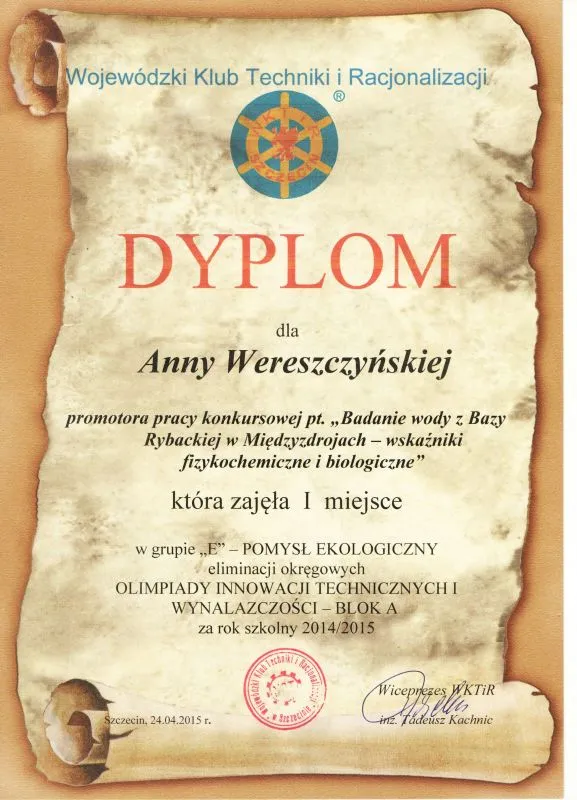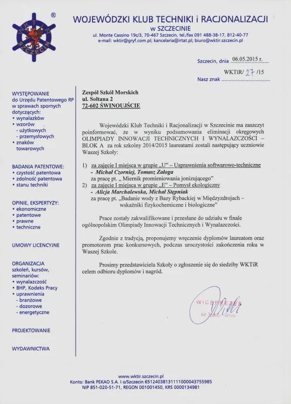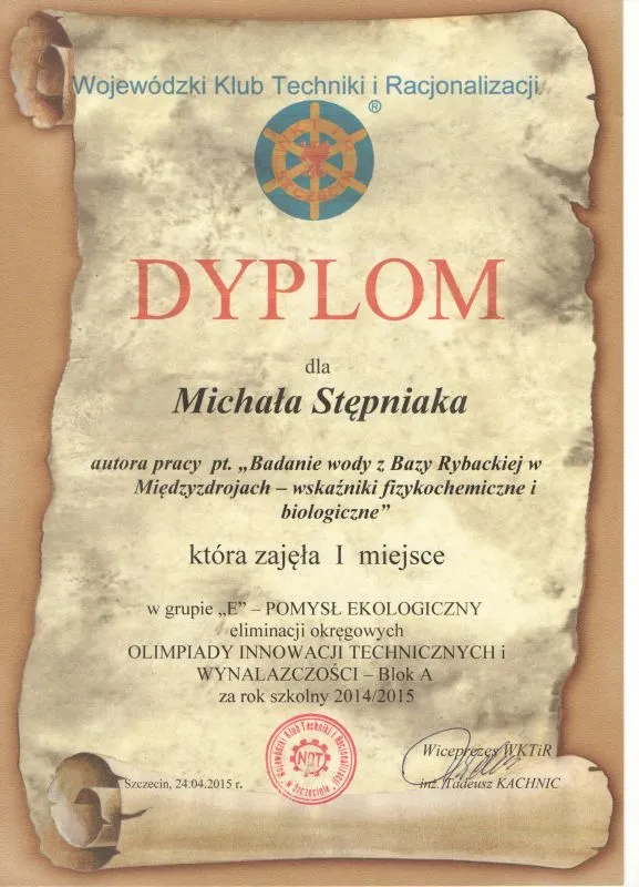 W dniu 6 maja 2015 jury etapu okręgowego poinformowało szkołę, że wyżej wymienieni uczniowie zostali laureatami eliminacji okręgowych. W związku z tym, że uczniowie zajęli I miejsca w obu kategoriach będą reprezentować okręg zachodniopomorski w finale ogólnopolskim Olimpiady Innowacji Technicznych i Wynalazczości. Trzymamy za nich kciuki!
