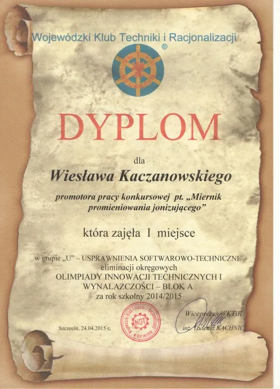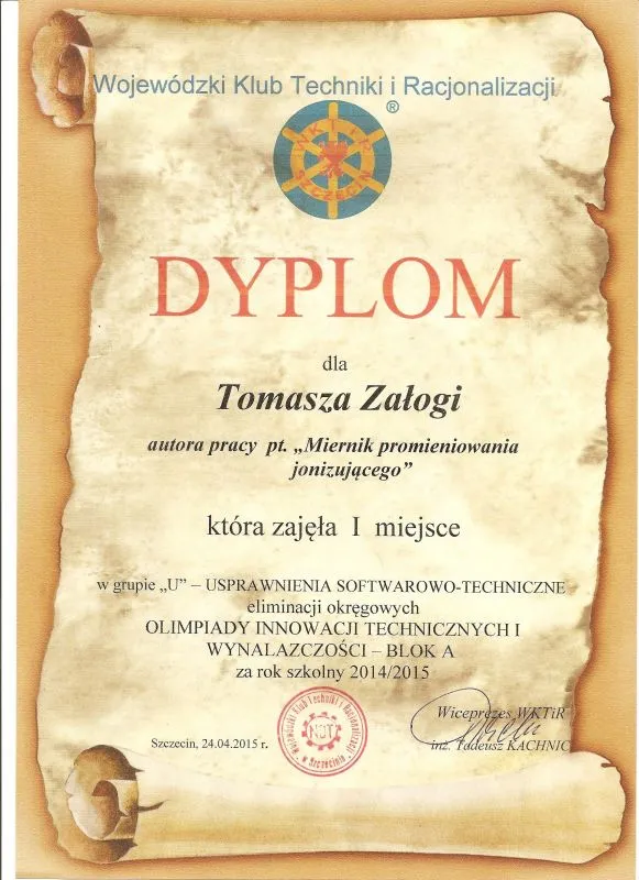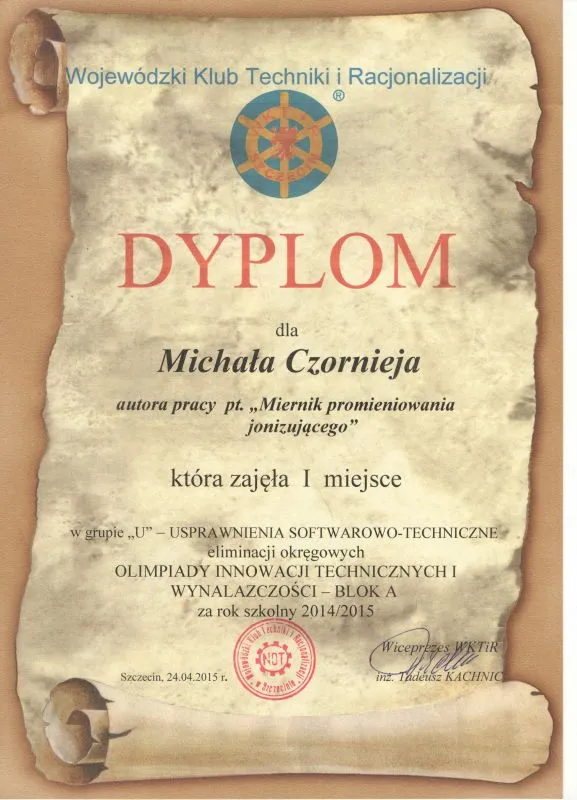 W trakcie kończącego się roku szkolnego cała czwórka brała udział w eliminacjach. W kategorii uczniowie klasy IV technik informatyk Michał Czorniej i Tomasza Załoga przygotowali pracę pt. "Miernik promieniowania jonizującego". Opiekunem uczniów był Pan Wiesław Kaczanowski. Innowacyjność przygotowanego projektu polega na wydzieleniu z tradycyjnego licznika dwóch osobnych, aczkolwiek niezbędnych do wspólnego działania częci: pomiarowej i przetwarzającej dane. Część pomiarowa zbiera wszystkie dane ze środowiska zewnętrznego tzn. ilość cząstek promieniowania, następnie za pomocą interfejsu Bluetooth licznik wysyła informacje do urządzenia wyposazonego w system Android np. telefon, tablet , laptop. Poprzez stworzone przez uczniów autorskie oprogramowanie system ten przetwarza dane i przedstawia w odpowiedniej formie. Część przetwarzająca dane, czyli aplikacja mobilna, pozwala również na sterowanie licznikiem.