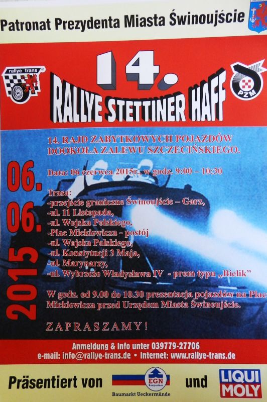 14. Rajd Zabytkowych Pojazdów Dookoła Zalewu Szczecińskiego w najbliższą sobotę 6 czerwca 2015 r. przejedzie przez Świnoujście. W godzinach 9.00 – 10.30 auta przejadą kolejno ulicami: dawne przejście graniczne Świnoujście – Garz, ulica 11 Listopada, Wojska Polskiego, Plac Mickiewicza i dalej Wojska Polskiego, Konstytucji 3 Maja, Marynarzy, Wybrzeże Władysława IV (prom „Bielik”).