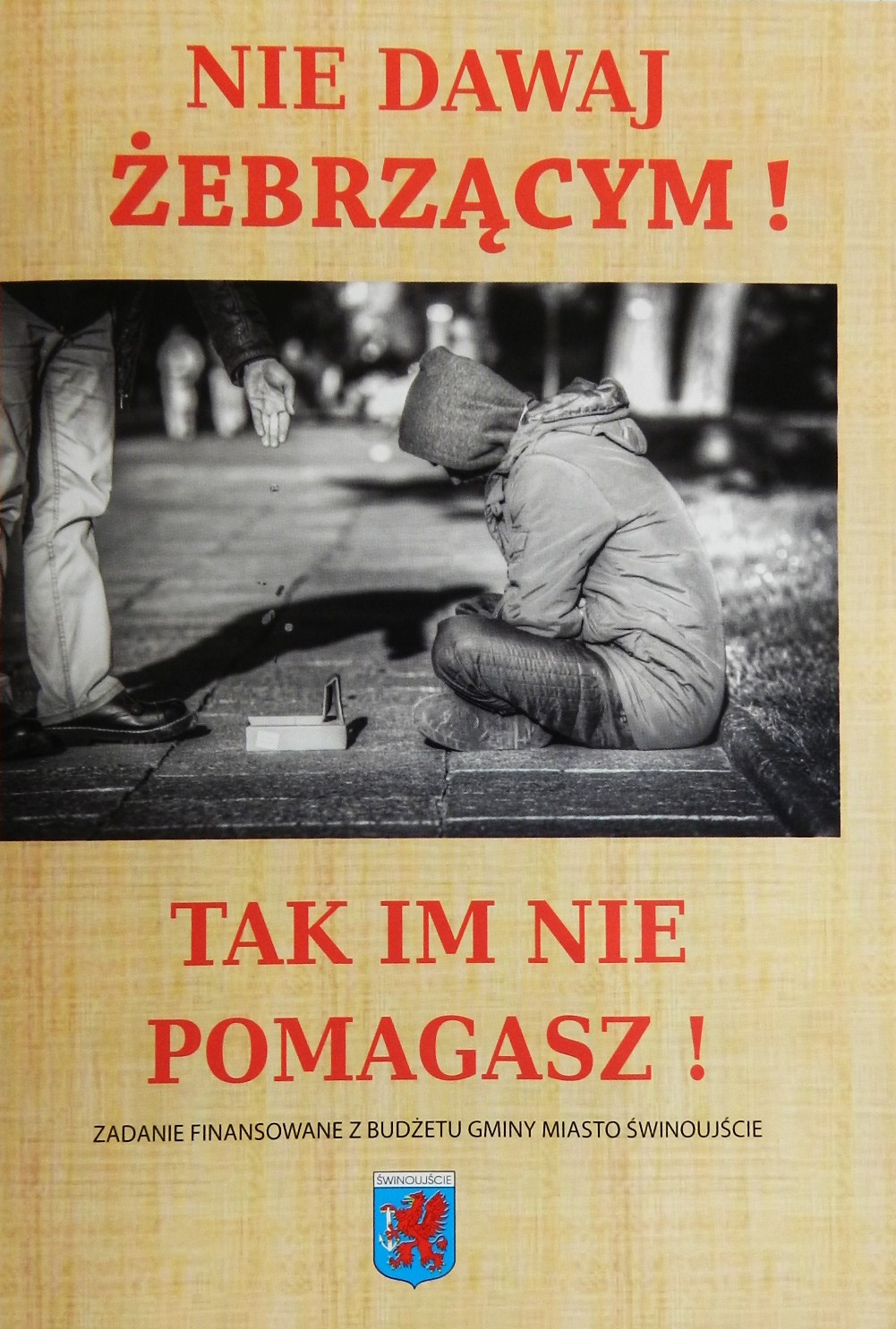 - to fragment tekstu z ulotki (na zdjęciu), który – jak mają nadzieję prowadzący akcję – przemówi do ludzi, którzy wciąż jeszcze dają pieniądze ludziom żebrzącym na ulicach. Oprócz tego w ulotce znajdują się dokładne adresy, numery telefonów organizacji i placówek, które pomagają potrzebującym.