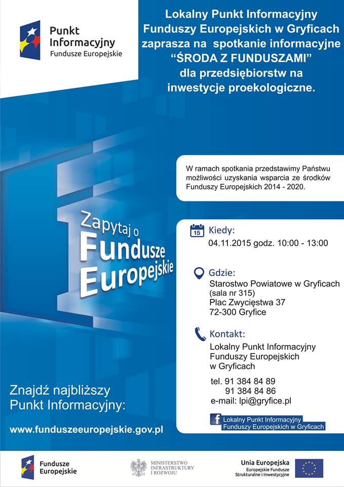 Punkt Informacyjny w Gryficach zaprasza na bezpłatne spotkanie informacyjne pt.: „Środa z funduszami dla przedsiębiorców na inwestycje proekologiczne”, które odbędzie się dnia 4 listopada 2015 r. o godzinie10.00w Starostwie Powiatowym w Gryficach sala 315.