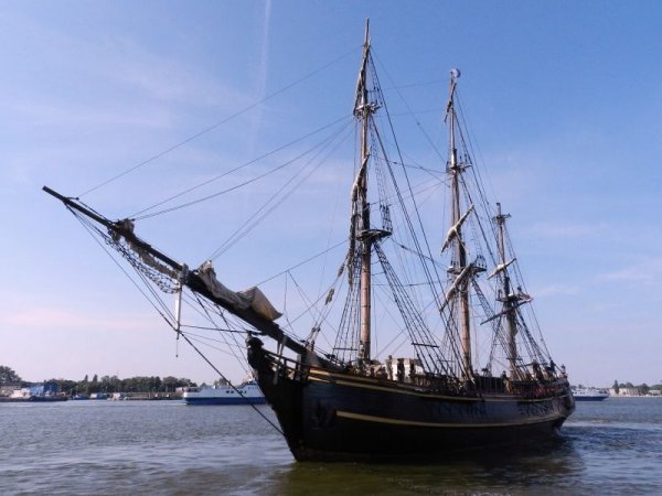 Manewrując w pełnym słońcu na świnoujskim kanale Bounty wyglądał rewelacyjnie. Taki prawdziwy, piracki, stary żaglowiec. Równie pięknie prezentuje się przy nabrzeżu.