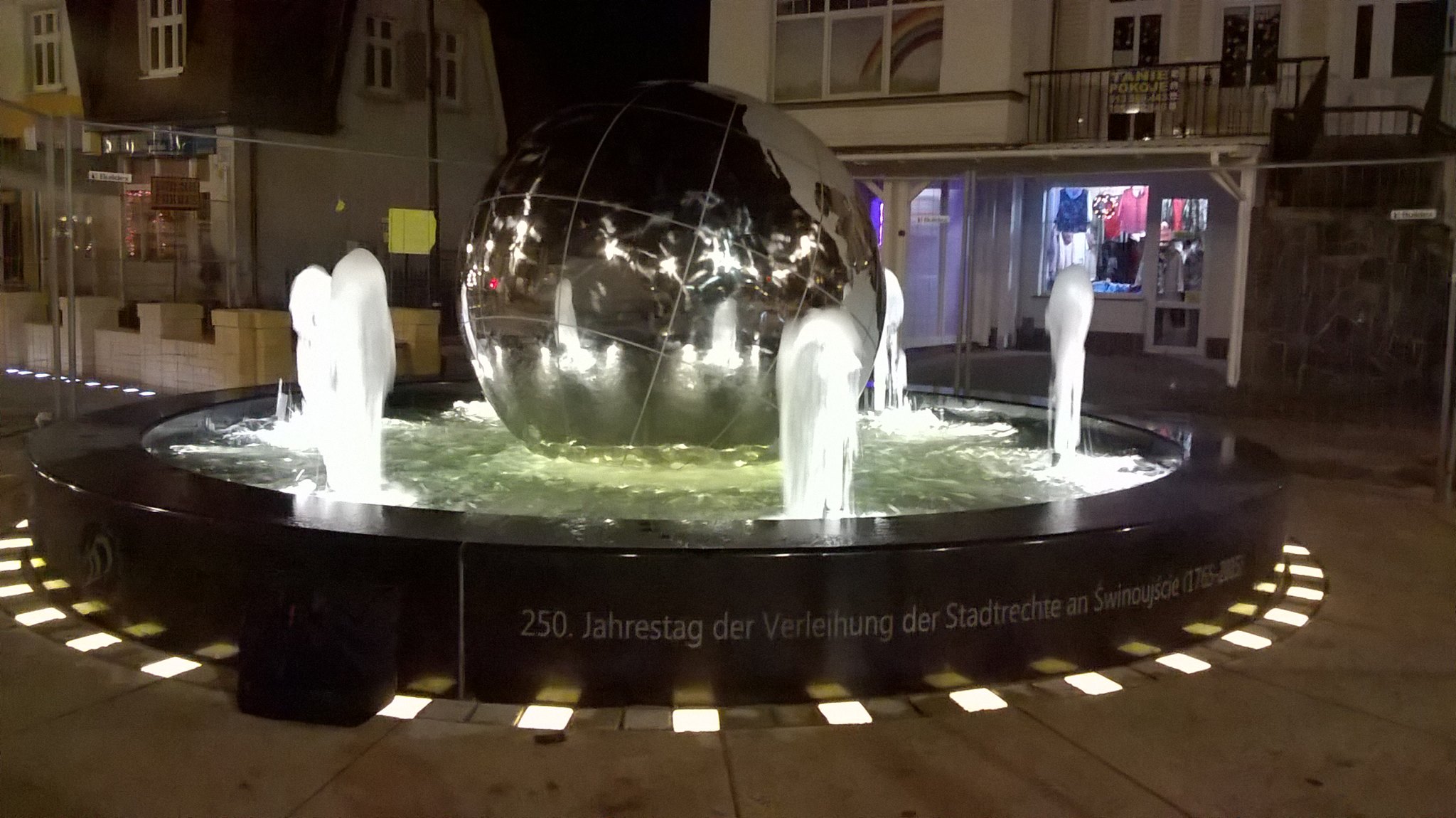 Wczoraj przeprowadzono próbę najnowszej świnoujskiej fontanny. Wielka kula imituje kulę ziemską. Fontanna powstała dla uczczenia 250-lecia nadania praw miejskich Świnoujściu, o czym informują napisy w trzech językach (polskim, angielskim i niemieckim), które znajdują się u jej podstawy. Fontanna znajduje się na deptaku Juliusza Słowackiego. Zobacz zdjęcia.