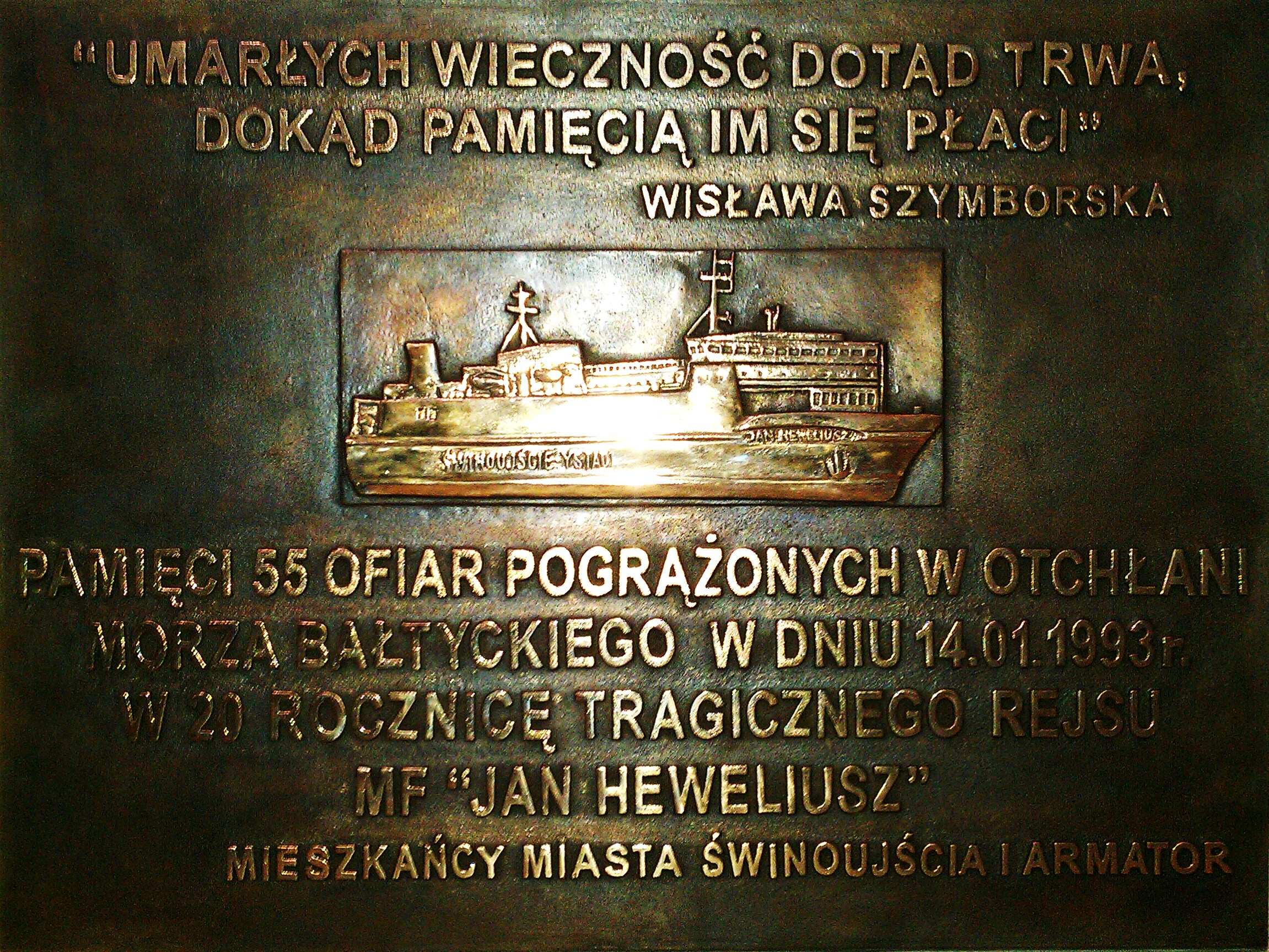 Prom samochodowo – kolejowy „Jan Heweliusz” zatonął 14 stycznia 1993 roku na Bałtyku, w czasie rejsu ze Świnoujścia do Ystad w Szwecji. Na morzu szalał sztorm, prędkość wiatru dochodziła do 160 km na godzinę. Po godzinie 4.00, znajdując się około 15 mil od przylądka Arkona na niemieckiej wyspie Rugia, statek przewrócił się na burtę, a następnie stępką do góry i po kilku godzinach zatonął. W tej największej powojennej morskiej tragedii, z udziałem polskiego statku, zginęło 55 osób – 20 marynarzy i 35 kierowców.