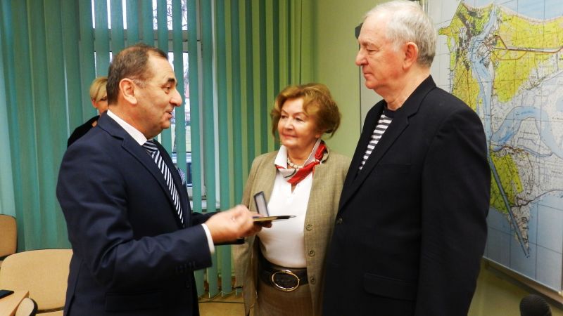 Na zdjęciu: Prezydent Świnoujścia Janusz Żmurkiewicz wręcza Jerzemu Porębskiemu odznakę Honorowego Obywatela Miasta Świnoujście. Obok żona wyróżnionego Helena Porębska.