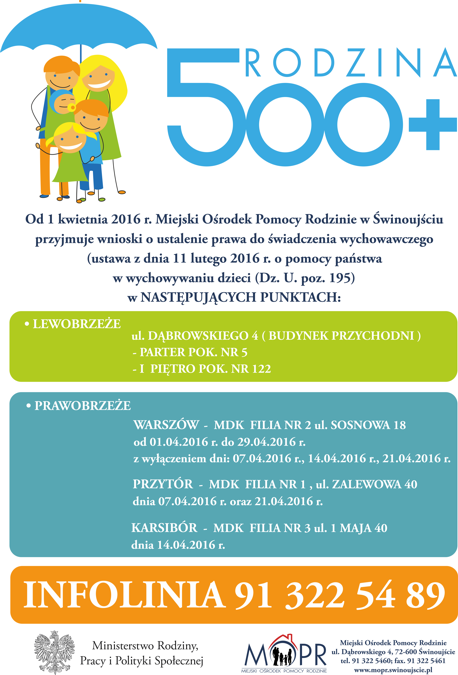 Pracownicy Miejskiego Ośrodka Pomocy Rodzinie w Świnoujściu przyjmują wnioski o ustalenie prawa do świadczenia wychowawczego (Rodzina 500 +) w budynku przy ulicy Dąbrowskiego 4 (budynek przychodni), parter pokój nr 5, w godzinach od 7:30 do 15:30 (na 2-gie i kolejne dzieci – bez kryterium dochodowego), I piętro pokój nr 122, w godzinach od 7:30 do 15:30 (na 1-sze i kolejne dzieci).