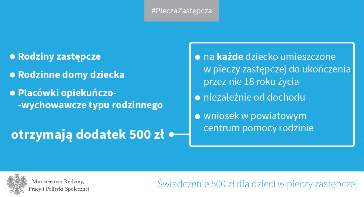 Dzieci w pieczy zastępczej otrzymają dodatkowe wsparcie w wysokości 500 zł miesięcznie. Dodatek w wysokości świadczenia wychowawczego będzie przysługiwać niezależnie od dochodu na każde dziecko w wieku do ukończenia 18 roku życia, umieszczone w rodzinie zastępczej, rodzinnym domu dziecka oraz placówce opiekuńczo-wychowawczej typu rodzinnego.