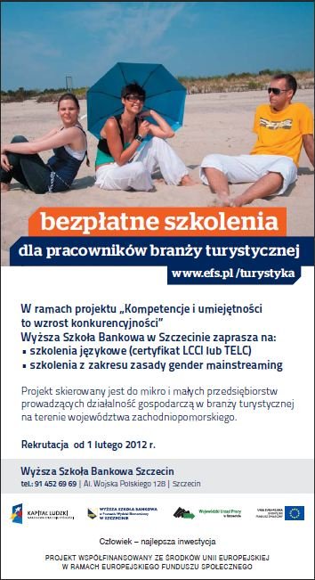 Wyższa Szkoła Bankowa w Poznaniu Wydział Ekonomiczny w Szczecinie zaprasza serdecznie na bezpłatne szkolenia językowe (język angielski i niemiecki). Projekt kierujemy do sektora mikro i małych przedsiębiorstw branży turystycznej, prowadzących działalność na terenie województwa zachodniopomorskiego.