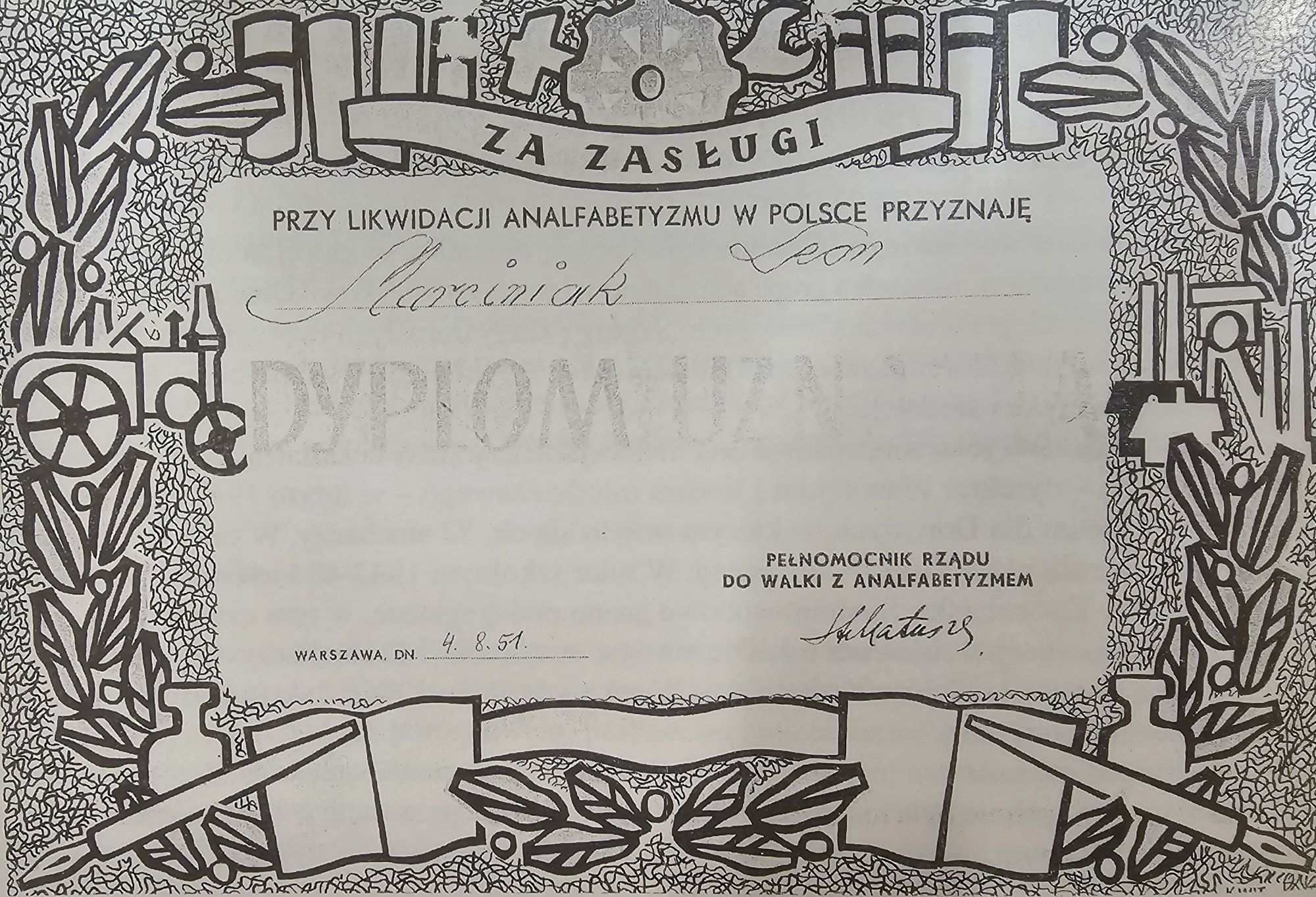 2. Dyplom przyznawany nauczycielom za walkę z analfabetyzmem – foto z książki „ Z dziejów oświaty świnoujskiej 1945-2005