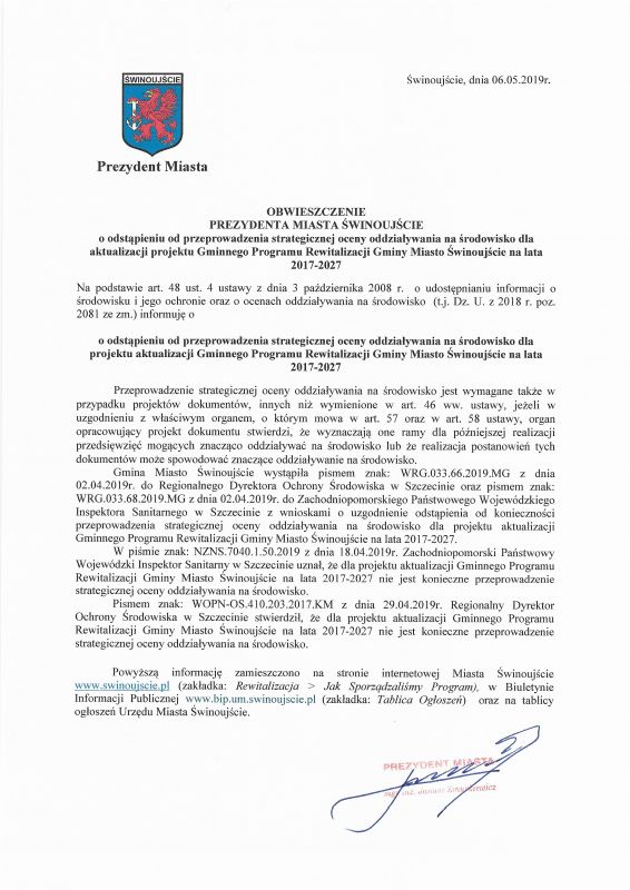 OBWIESZCZENIE Prezydenta Miasta Świnoujście z dnia 17 sierpnia 2017 roku o odstąpieniu od przeprowadzenia strategicznej oceny oddziaływania na środowisko dla projektu Gminnego Programu Rewitalizacji Gminy Miasto Świnoujście na lata 2017–2027